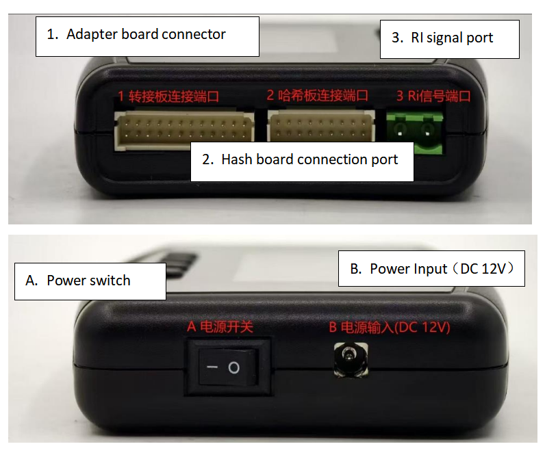 1. Adapter board connection port 2. Hash board connection port 3. RI signal return interface