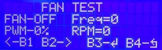 1. After connecting the fan test adapter board, select "FAN TEST" on the main interface of the test stand. Note! The fan test requires a separate power supply. The tester does not supply power to the fan. After the adapter board is inserted, the test stand automatically enters the fan test mode. Press the OK button to turn on the fan switch, and press the left and right buttons to test the fan speed and frequency respectively.