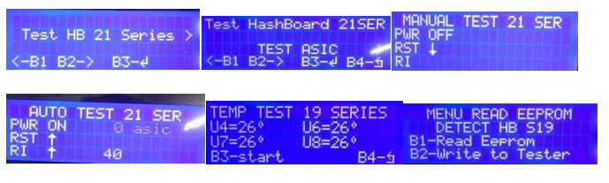 2. After entering the test interface, press the B2 button (right button) to select the test mode: TEST ASIC (hash board chip quantity test)/TEST TEMP (hash board temperature test)/REPAIR EEPROM (hash board EEPROM editing).
