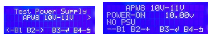 2. The power source needs to turn off the test stand first, then press and hold the test stand B3 (confirmation button) to turn on the test stand, and enter the power supply test mode after turning on. Press the left and right buttons to select the power supply model, and then press the confirmation button to enter the test. If the power supply is damaged or the data interface is in poor contact, "NO PSU" will be displayed. If the power supply is normal, press the left and right buttons to adjust the voltage output by the power supply, indicating that the power supply is operating normally.