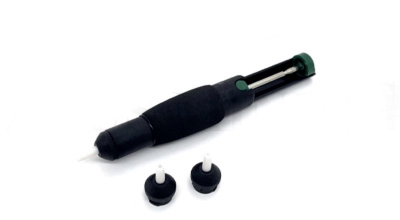 Desoldering pump with high vacuum force, it’s especially used for clearing hash boards in re-work jobs and field repairing. Solder removal from assembled PCBs. It has a suction power of 35Hg-Cn and has 2 spare heads. Use this tool to quickly remove built-up tin.