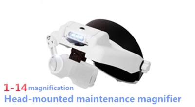 Head-mounted maintenance magnifier, multiple sets of lenses, multiple magnifications, suitable for watch, mechanical and electronic maintenance. Three-mirror superposition combination, 1-14 times magnification can be changed at will. Wrapped in breathable knitted fabric, soft padding, comfortable to wear; 3 white LEDs, adjustable angle; front and rear movable lens design, users with different eyesight can adjust the lens group front and back to focus clearly.